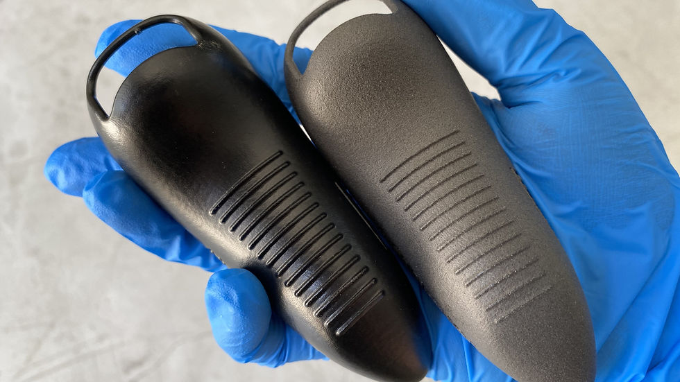 ▲左が「VX1」による表面処理後、右が処理前のもの。粉末材料由来のざらつきが滑らかな質感へと変化します。見た目のほかにも表面の強度、撥水性、耐薬品性が向上します。